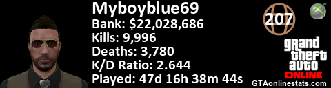 <a href="http://GTAonlinestats.com/showplayer/Myboyblue69"><img src="http://GTAonlinestats.com/signature/Myboyblue69/sig.png" alt="Myboyblue69" border="0" /></a>