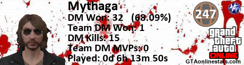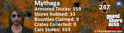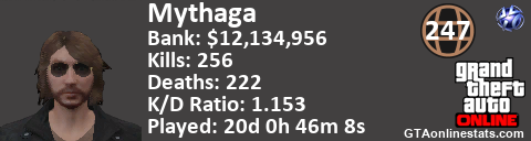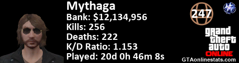 [URL=http://GTAonlinestats.com/showplayer/Mythaga/2][IMG]http://GTAonlinestats.com/signature/Mythaga/2/sig.png[/IMG][/URL]