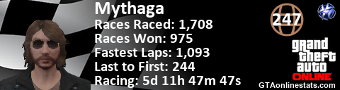 [URL=http://GTAonlinestats.com/showplayer/Mythaga/2][IMG]http://GTAonlinestats.com/racesignature/Mythaga/2/sig.png[/IMG][/URL]