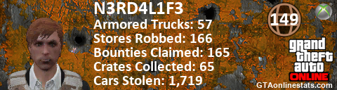 [URL=http://GTAonlinestats.com/showplayer/N3RD4L1F3][IMG]http://GTAonlinestats.com/dmsignature/N3RD4L1F3/sig.png[/IMG][/URL]