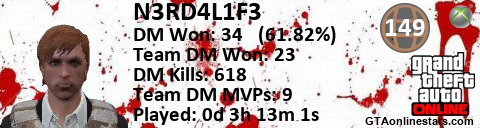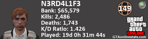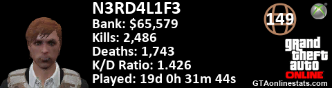 <a href="http://GTAonlinestats.com/showplayer/N3RD4L1F3"><img src="http://GTAonlinestats.com/dmsignature/N3RD4L1F3/sig.png" alt="N3RD4L1F3" border="0" /></a>