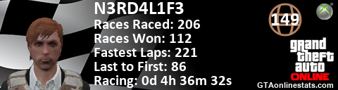 <a href="http://GTAonlinestats.com/showplayer/N3RD4L1F3"><img src="http://GTAonlinestats.com/racesignature/N3RD4L1F3/sig.png" alt="N3RD4L1F3" border="0" /></a>