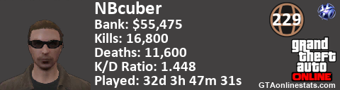 [URL=http://GTAonlinestats.com/showplayer/NBcuber][IMG]http://GTAonlinestats.com/greysignature/NBcuber/sig.png[/IMG][/URL]