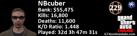<a href="http://GTAonlinestats.com/showplayer/NBcuber"><img src="http://GTAonlinestats.com/signature/NBcuber/sig.png" alt="NBcuber" border="0" /></a>