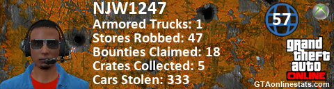 [URL=http://GTAonlinestats.com/showplayer/NJW1247][IMG]http://GTAonlinestats.com/crimesignature/NJW1247/sig.png[/IMG][/URL]