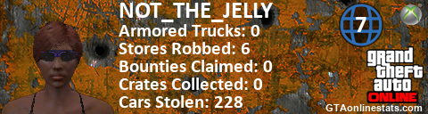 <a href="http://GTAonlinestats.com/showplayer/NOT_THE_JELLY/2"><img src="http://GTAonlinestats.com/crimesignature/NOT_THE_JELLY/2/sig.png" alt="NOT_THE_JELLY" border="0" /></a>
