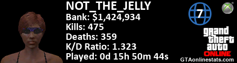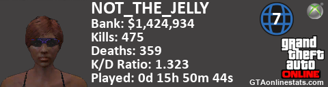 <a href="http://GTAonlinestats.com/showplayer/NOT_THE_JELLY/2"><img src="http://GTAonlinestats.com/dmsignature/NOT_THE_JELLY/2/sig.png" alt="NOT_THE_JELLY" border="0" /></a>