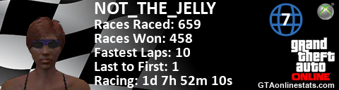 [URL=http://GTAonlinestats.com/showplayer/NOT_THE_JELLY/2][IMG]http://GTAonlinestats.com/racesignature/NOT_THE_JELLY/2/sig.png[/IMG][/URL]