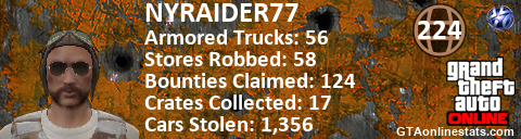 [URL=http://GTAonlinestats.com/showplayer/NYRAIDER77][IMG]http://GTAonlinestats.com/randomsignature/NYRAIDER77/sig.png[/IMG][/URL]