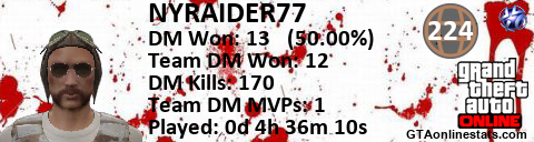 [URL=http://GTAonlinestats.com/showplayer/NYRAIDER77][IMG]http://GTAonlinestats.com/dmsignature/NYRAIDER77/sig.png[/IMG][/URL]