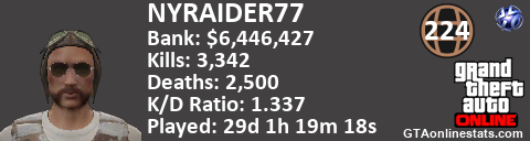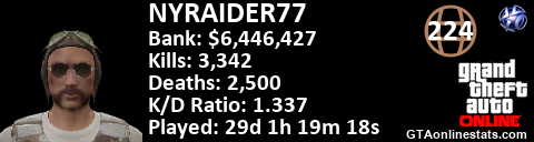 <a href="http://GTAonlinestats.com/showplayer/NYRAIDER77"><img src="http://GTAonlinestats.com/signature/NYRAIDER77/sig.png" alt="NYRAIDER77" border="0" /></a>