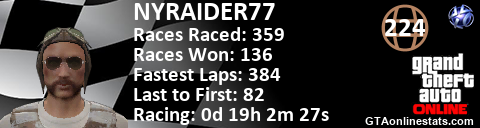 <a href="http://GTAonlinestats.com/showplayer/NYRAIDER77"><img src="http://GTAonlinestats.com/racesignature/NYRAIDER77/sig.png" alt="NYRAIDER77" border="0" /></a>