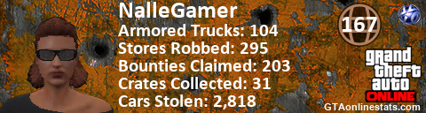 [URL=http://GTAonlinestats.com/showplayer/NalleGamer][IMG]http://GTAonlinestats.com/signature/NalleGamer/sig.png[/IMG][/URL]