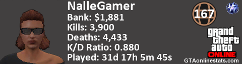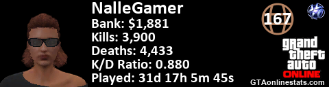 <a href="http://GTAonlinestats.com/showplayer/NalleGamer"><img src="http://GTAonlinestats.com/dmsignature/NalleGamer/sig.png" alt="NalleGamer" border="0" /></a>
