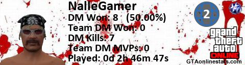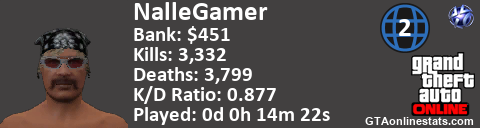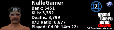 [URL=http://GTAonlinestats.com/showplayer/NalleGamer/2][IMG]http://GTAonlinestats.com/dmsignature/NalleGamer/2/sig.png[/IMG][/URL]