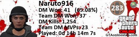 [URL=http://GTAonlinestats.com/showplayer/Naruto916][IMG]http://GTAonlinestats.com/signature/Naruto916/sig.png[/IMG][/URL]