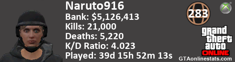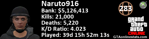 <a href="http://GTAonlinestats.com/showplayer/Naruto916"><img src="http://GTAonlinestats.com/signature/Naruto916/sig.png" alt="Naruto916" border="0" /></a>