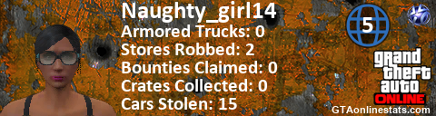 [URL=http://GTAonlinestats.com/showplayer/Naughty_girl14][IMG]http://GTAonlinestats.com/crimesignature/Naughty_girl14/sig.png[/IMG][/URL]