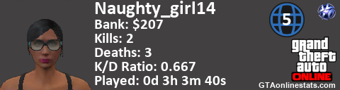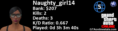 <a href="http://GTAonlinestats.com/showplayer/Naughty_girl14"><img src="http://GTAonlinestats.com/signature/Naughty_girl14/sig.png" alt="Naughty_girl14" border="0" /></a>