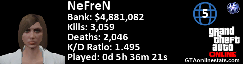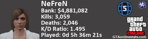 [URL=http://GTAonlinestats.com/showplayer/NeFreN/2][IMG]http://GTAonlinestats.com/signature/NeFreN/2/sig.png[/IMG][/URL]