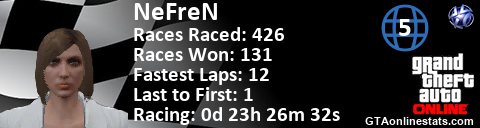 [URL=http://GTAonlinestats.com/showplayer/NeFreN/2][IMG]http://GTAonlinestats.com/racesignature/NeFreN/2/sig.png[/IMG][/URL]