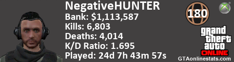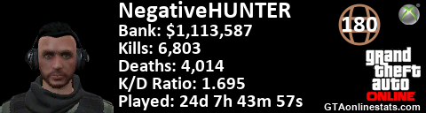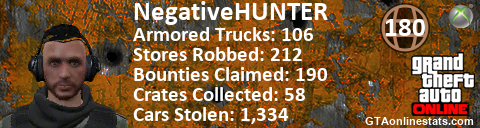 <a href="http://GTAonlinestats.com/showplayer/NegativeHUNTER"><img src="http://GTAonlinestats.com/signature/NegativeHUNTER/sig.png" alt="NegativeHunter" border="0" /></a>