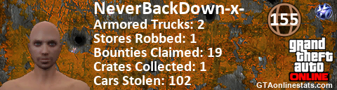 [URL=http://GTAonlinestats.com/showplayer/NeverBackDown-x-][IMG]http://GTAonlinestats.com/crimesignature/NeverBackDown-x-/sig.png[/IMG][/URL]