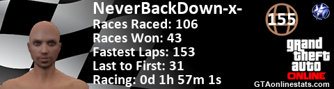 [URL=http://GTAonlinestats.com/showplayer/NeverBackDown-x-][IMG]http://GTAonlinestats.com/racesignature/NeverBackDown-x-/sig.png[/IMG][/URL]