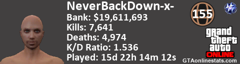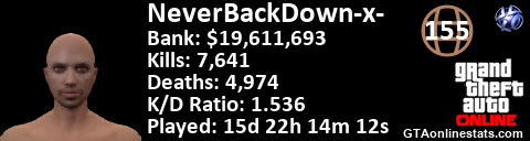 [URL=http://GTAonlinestats.com/showplayer/NeverBackDown-x-][IMG]http://GTAonlinestats.com/signature/NeverBackDown-x-/sig.png[/IMG][/URL]