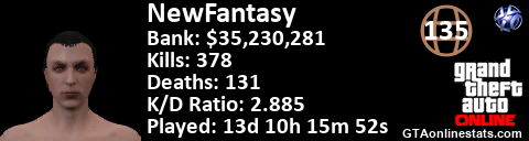 [URL=http://GTAonlinestats.com/showplayer/NewFantasy][IMG]http://GTAonlinestats.com/signature/NewFantasy/sig.png[/IMG][/URL]