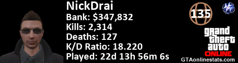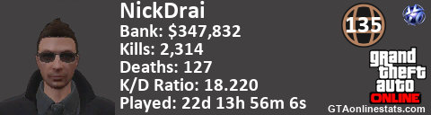 <a href="http://GTAonlinestats.com/showplayer/NickDrai"><img src="http://GTAonlinestats.com/greysignature/NickDrai/sig.png" alt="NickDrai" border="0" /></a>