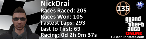 [URL=http://GTAonlinestats.com/showplayer/NickDrai][IMG]http://GTAonlinestats.com/racesignature/NickDrai/sig.png[/IMG][/URL]