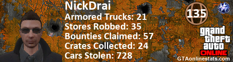 [URL=http://GTAonlinestats.com/showplayer/NickDrai][IMG]http://GTAonlinestats.com/signature/NickDrai/sig.png[/IMG][/URL]