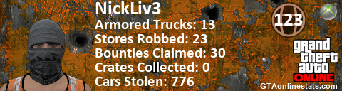 [URL=http://GTAonlinestats.com/showplayer/NickLiv3][IMG]http://GTAonlinestats.com/crimesignature/NickLiv3/sig.png[/IMG][/URL]