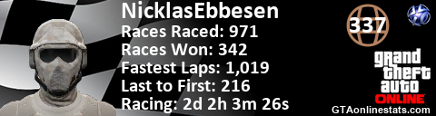 [URL=http://GTAonlinestats.com/showplayer/NicklasEbbesen][IMG]http://GTAonlinestats.com/racesignature/NicklasEbbesen/sig.png[/IMG][/URL]