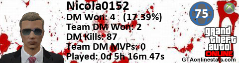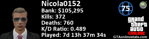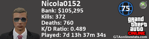 <a href="http://GTAonlinestats.com/showplayer/Nicola0152"><img src="http://GTAonlinestats.com/dmsignature/Nicola0152/sig.png" alt="Nicola0152" border="0" /></a>