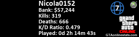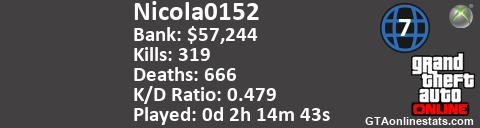 <a href="http://GTAonlinestats.com/showplayer/Nicola0152/2"><img src="http://GTAonlinestats.com/dmsignature/Nicola0152/2/sig.png" alt="Nicola0152" border="0" /></a>