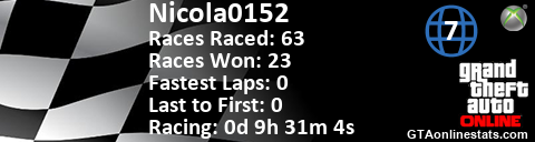 <a href="http://GTAonlinestats.com/showplayer/Nicola0152/2"><img src="http://GTAonlinestats.com/racesignature/Nicola0152/2/sig.png" alt="Nicola0152" border="0" /></a>