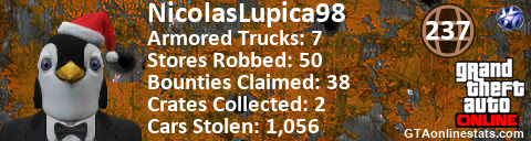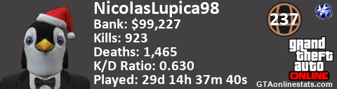 [URL=http://GTAonlinestats.com/showplayer/NicolasLupica98][IMG]http://GTAonlinestats.com/randomsignature/NicolasLupica98/sig.png[/IMG][/URL]