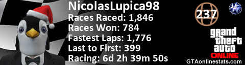 <a href="http://GTAonlinestats.com/showplayer/NicolasLupica98"><img src="http://GTAonlinestats.com/racesignature/NicolasLupica98/sig.png" alt="NicolasLupica98" border="0" /></a>