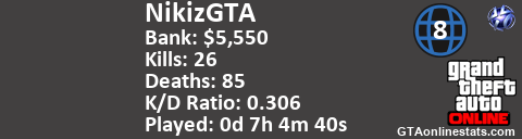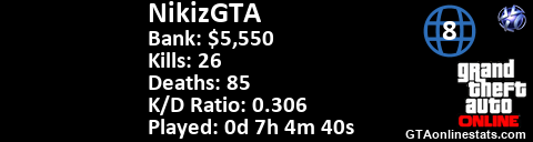 <a href="http://GTAonlinestats.com/showplayer/NikizGTA"><img src="http://GTAonlinestats.com/signature/NikizGTA/sig.png" alt="NikizGTA" border="0" /></a>