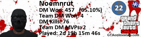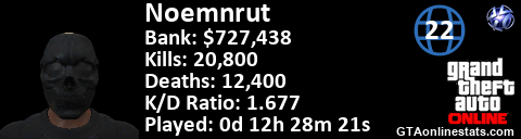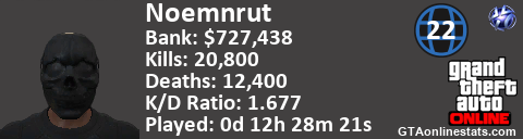 [URL=http://GTAonlinestats.com/showplayer/Noemnrut/3][IMG]http://GTAonlinestats.com/signature/Noemnrut/3/sig.png[/IMG][/URL]