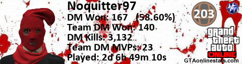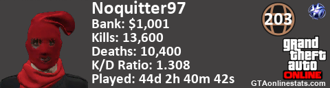 [URL=http://GTAonlinestats.com/showplayer/Noquitter97][IMG]http://GTAonlinestats.com/dmsignature/Noquitter97/sig.png[/IMG][/URL]