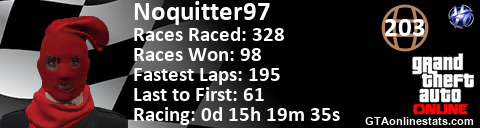 <a href="http://GTAonlinestats.com/showplayer/Noquitter97"><img src="http://GTAonlinestats.com/racesignature/Noquitter97/sig.png" alt="Noquitter97" border="0" /></a>
