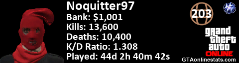 <a href="http://GTAonlinestats.com/showplayer/Noquitter97"><img src="http://GTAonlinestats.com/signature/Noquitter97/sig.png" alt="Noquitter97" border="0" /></a>
