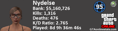 [URL=http://GTAonlinestats.com/showplayer/Nydelse][IMG]http://GTAonlinestats.com/dmsignature/Nydelse/sig.png[/IMG][/URL]