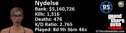 [URL=http://GTAonlinestats.com/showplayer/Nydelse][IMG]http://GTAonlinestats.com/signature/Nydelse/sig.png[/IMG][/URL]
