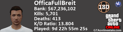 [URL=http://GTAonlinestats.com/showplayer/OfficaFullBreit][IMG]http://GTAonlinestats.com/randomsignature/OfficaFullBreit/sig.png[/IMG][/URL]