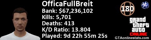 [URL=http://GTAonlinestats.com/showplayer/OfficaFullBreit][IMG]http://GTAonlinestats.com/dmsignature/OfficaFullBreit/sig.png[/IMG][/URL]