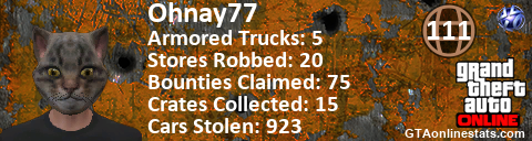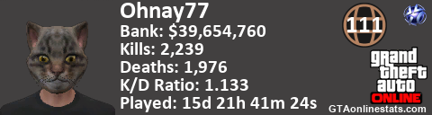 <a href="http://GTAonlinestats.com/showplayer/Ohnay77"><img src="http://GTAonlinestats.com/signature/Ohnay77/sig.png" alt="Ohnay77" border="0" /></a>